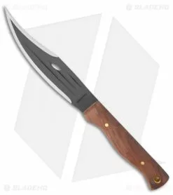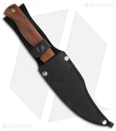 The Jungle Bowie 2 fixed blade is a smaller version of the Jungle Bowie. It has a black epoxy powder coated 1075 high carbon steel blade with a sharpened upper edge. The hardwood scales are contoured for excellent grip and feel. The Jungle Bowie II comes with a black leather sheath for belt carry.