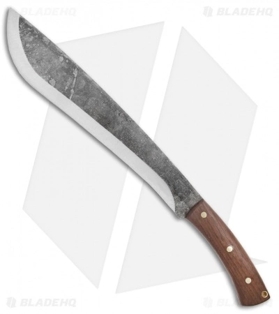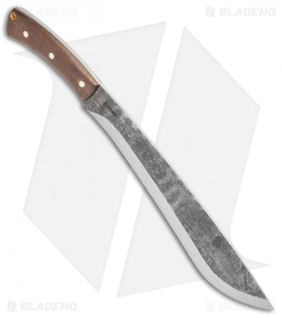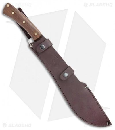 This Condor Jungolo Machete features a large carbon steel blade and a walnut wood handle. The blade is made from 1075 high carbon steel with a black patina finish. Every edge of this machete has been hand finished and honed to a razor sharp edge. The handle provides a smooth, curved grip with brass pins and a lanyard hole. Item includes a high quality, handcrafted leather sheath.