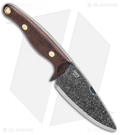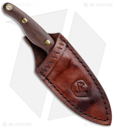 The Kimen from Condor Tool & Knife is a compact camping and general use knife. It features a contoured dark walnut wood handle with a natural finished 1095 high carbon steel blade. The blade has a blunted tip and two dimples on either side of the spine that offer increased control. The leather sheath comes equipped with belt loop for easy belt carry.