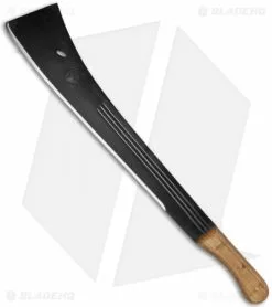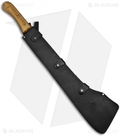 The Tapanga Machete from Condor Tool & Knife has a epoxy black powder coated 1075 high carbon steel blade. The handle is riveted hardwood. This knife includes a black leather sheath.