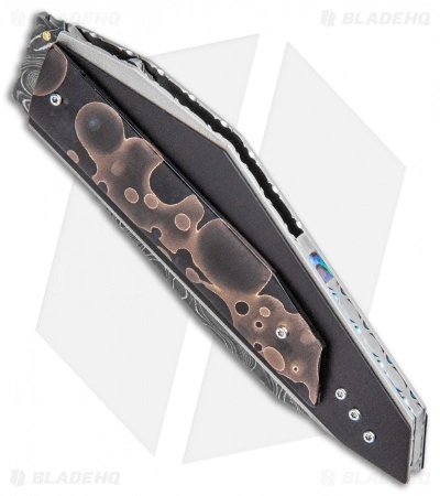 This N Able folder features resin composite scales with black G-10 accents over a titanium liner lock frame. The blade is Damascus steel with a tang-end flipper that works in tandem with the ball-bearing pivot to provide smooth, effortless action. This knife has been embellished with filework on the blade spine, liners and backspacer. The backspacer has an abalone inlay.