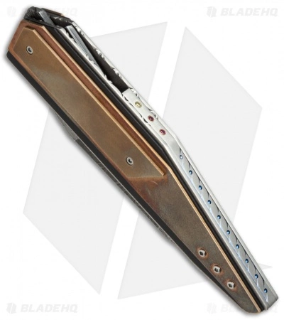 This D TER flipper is stunning. It’s angular lines and precision craftsmanship make it a worthy centerpiece. The handle features copper beryllium onlays, contrasted with black G-10 underlays. Texas Steel Damascus steel is hollow ground and the blade opens by pulling the tang flipper. The ball-bearing pivot provides smooth, effortless action. This knife has been embellished with filework on the blade spine, liners and back spacer, which is also adorned with ruby and citrine inserts.
