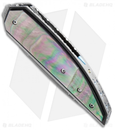 This Corrie Schoeman D-Lete model has a Mother-of-Pearl handle over black G-10 liners and a beautiful Damascus steel dagger blade. The backspacer has a gem inlay and artistic filework. The front flipper action is smooth fast, running on caged bearings. Pictures are of the actual knife for sale.