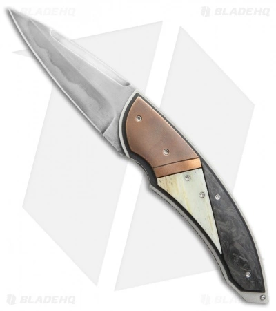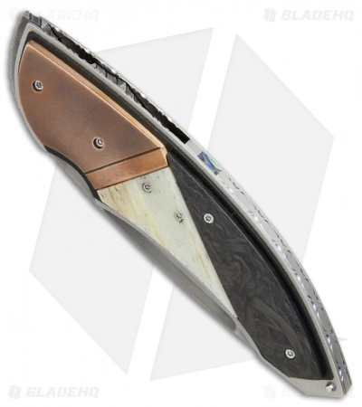 The Panerai Flipper knife from Corrie Schoeman is an impressive design. The handle features giraffe bone and carbon fiber over a thin black G-10 scale. The liners and titanium backstrap are filed and feature an abalone insert on the spacer. The modified spear point style blade is 1095 steel that has been heat treated to form a Hamon blade. The action on this knife is super smooth with a caged ball-bearing pivot and it has an excellent build.