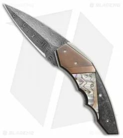 This X-Ecute model sports a carbon fiber and abalone handle with brass bolsters and a damascus blade.