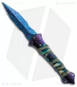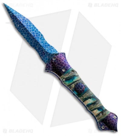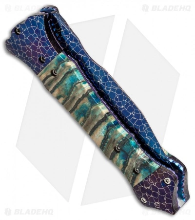 This custom Mini Eos automatic is hand made by Cory Vallotton and features a Bertie Rietveld “Nebula” damascus steel blade. Matching bolsters and firing button complete a Green Mammoth Molar handle with anodized titanium liners and a ridged stainless steel backspacer. The Mini Eos comes in a padded zipper pouch with a signed certificate of authenticity.
