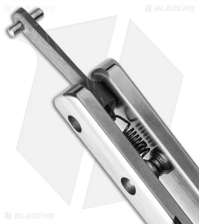 This custom butterfly knife from Craig Camerer showcases a Kampilan style blade, based on the Filipino sword. It is Hamon finished and has a sharpened upper grind. The titanium handles are dovetailed with marbled carbon fiber inlays and it’s outfitted with a Damascus latch. This butterfly knife stands out with its great looks and finish.