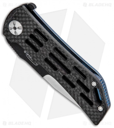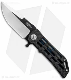 This Darrel Ralph custom Ventilator knife features a skeletonized carbon fiber front handle and a blue tumbled titanium frame lock with milled grooves for reduced weight. It has a unique two-tone blade in a clip point style made from premium stainless steel. A curved titanium pocket clip tops off this one of a kind custom design.