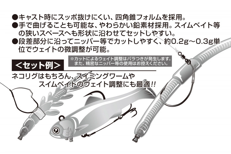 Decoy DS-10 Nail Sinkers ovat nopein tapa säätää swimbaitin putoamisnopeutta ja vakauttaa sen uintitasapainoa, lisätä painoa takiloituun matoon, kuten Neko ja wacky -tekniikoissa, tai painottaa fluken tai paddletailin päätä nokka alaspäin suuntautuvaa esitystä varten. DS10 Nail -nielusukeltajat on suunniteltu kovilla harjanteilla muoviin tarttumista varten, joten ne eivät putoa ulos, kun ne on kerran asetettu paikalleen.