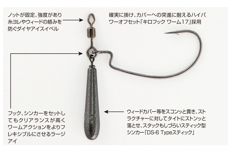 Jikka-takilauksen ykkösvalinta, tekniikka, jossa pehmytmuovit asetetaan vaakasuoraan juuri pohjan yläpuolelle, jolloin viehe liikkuu vapaasti. Decoy ZERO-DAN Worm 217 -koukku on rakennettu käyttäen nosturikierrettä, joka on kiinnitetty pisarapainoon ja erittäin terävään EWG offset -koukkuun, ja se on erittäin vastustuskykyinen tarttumiselle ja estää kaloja käyttämästä jigiä vipuvoimana koukun sylkemiseen.Täydellinen Jikka-rigiinSuper terävä EWG offset-koukkuKappaletta per pakkaus2,5g – #4: 32.5g – #3: 23.5g – #2: 23.5g – #1: 25g – #1/0: 25g – #2/0: 27g – #3/0: 27g – #4/0: 27g – #5/0: 27g – #5/0: 2