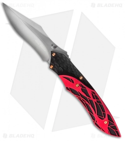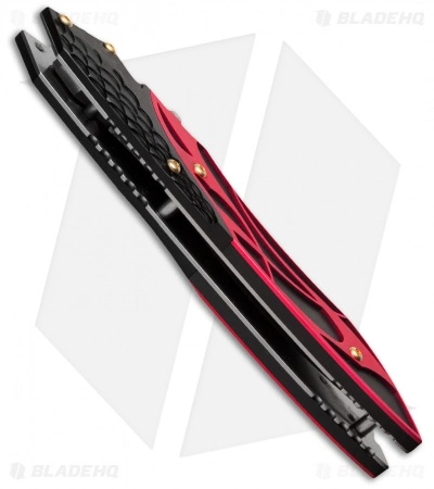 The Ichi from Dew Hara is a custom creation with a fantastic look and great feel in hand. It’s decorated with a red anodized cutout onlay and machined black aluminum scales over a stainless steel liner lock frame. Includes a Japanese Kimono pouch. This knife is direct from maker.