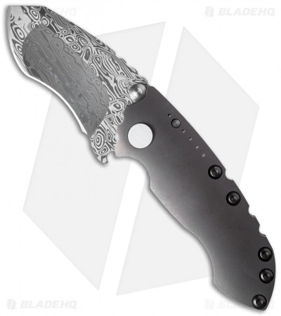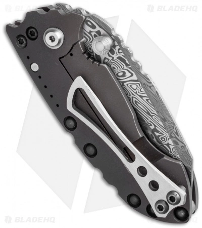This S-90 folder is a top-notch piece from DireWare . It features a Damasteel blade with hollow grinds and a flat ground tip. The open-built framelock handle is bronze finished titanium with a brushed satin pocket clip.