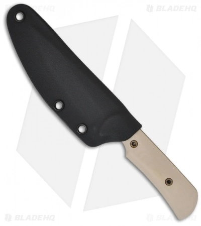 Dirk Pinkerton is known for making beautiful knives like this. This knife features a Chad Nichols Damascus steel blade with a ladder dot pattern. The ivory micarta handle scales provide a visually appealing contrast. Included is a kydex sheath.