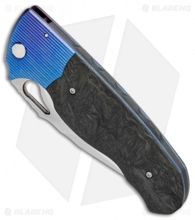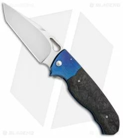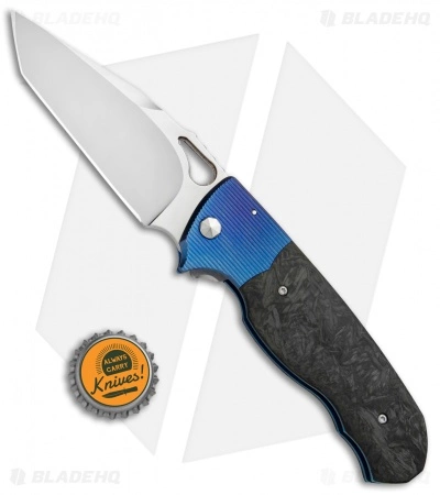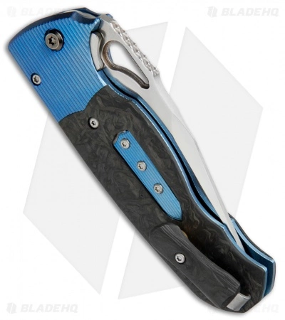 This Revolution model has a satin finished tanto blade and a carbon fiber handle with a blue anodized titanium bolster.
