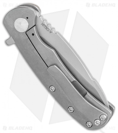 This custom Designated Marksman from Doc Shiffer is a beauty. It features an OD green micarta handle with a titanium frame and pocket clip. The bead blast finished Nitro-V steel blade opens with a push of the flipper. IKBS bearings give this knife smooth performance.