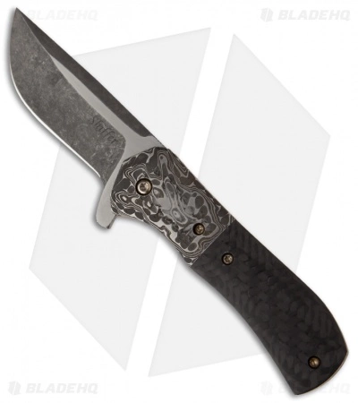 This Dress Recon from Doc Shiffer features a classy Chad Nichols Damascus bolster and carbon fiber scale on the handle with an anodized titanium frame lock, back spacer and pocket clip. The drop point blade is two-tone finished with satin flats and acid washed grinds.