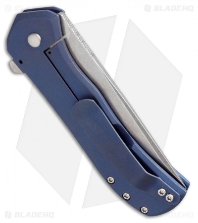The Field Grade Recon folder is a mid-tech model from Doc Shiffer Knives that displays excellent build quality and smooth action. It has a stonewashed blade with flipper opener and a tumbled, blue anodized titanium handle, pocket clip, and back spacer. The titanium is 0.15″ thick and the edges are chamfered for comfort.