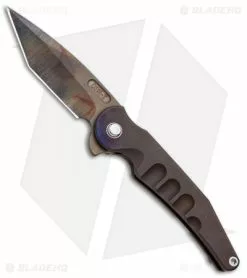 DSK Tactical knives are known for their overbuilt and heavy designs. While the DSK Tactical Prick does not follow this typical design, it definitely is no slouch. This model features an flamed blade with a stonewashed purple and bronze flamed titanium handle. It comes with a gray titanium tip-up pocket clip for convenient, everyday carry.
