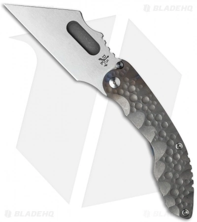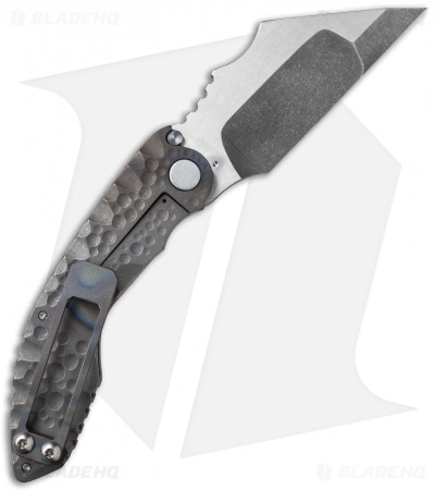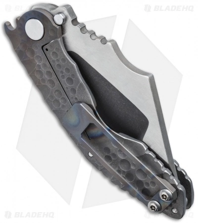 Not only large and powerful by design, the VX-C is an eye-catching knife with a lot of custom details to give it a unique look and feel. The blade on this knife is chisel ground with polished satin flats and an acid stonewashed compound hollow/flat ground edge. 3/16″ thick titanium slabs on the handle are dimpled and have a sculpted pattern around the edges.