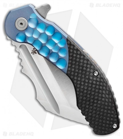 The DSK Tactical VX-P comes in as a production knife from DSK. The VX-P is a full-size tactical folder that opens with the flipper. It has a titanium handle with carbon fiber scales, and a drastic Wharncliffe blade made of CPM-20CV. This model has been overhauled with a blue anodized hammered textured titanium handle.