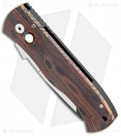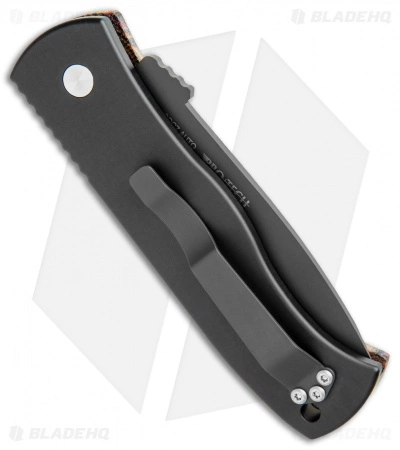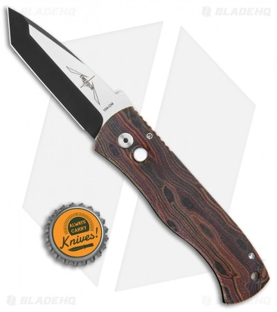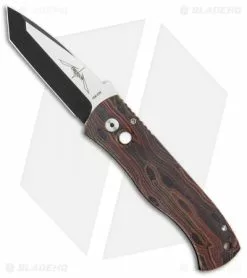This Emerson/Pro-Tech CQC-7 automatic knife features a brown grain micarta front scale and a mosaic pin push button insert with a black anodized aluminum frame. Includes a pocket clip. The tanto style blade is black finished 154-CM stainless steel.