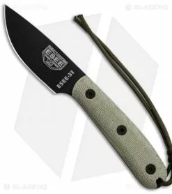 The ESEE-3HM fixed blade knife features a black finished 1095 steel blade with a plain cutting edge, canvas Micarta scales and a traditional handle design with a smooth rounded pommel. This ESEE model includes a leather sheath with a belt loop.