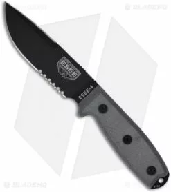 - Black, double-edged, serrated 1095 blade.