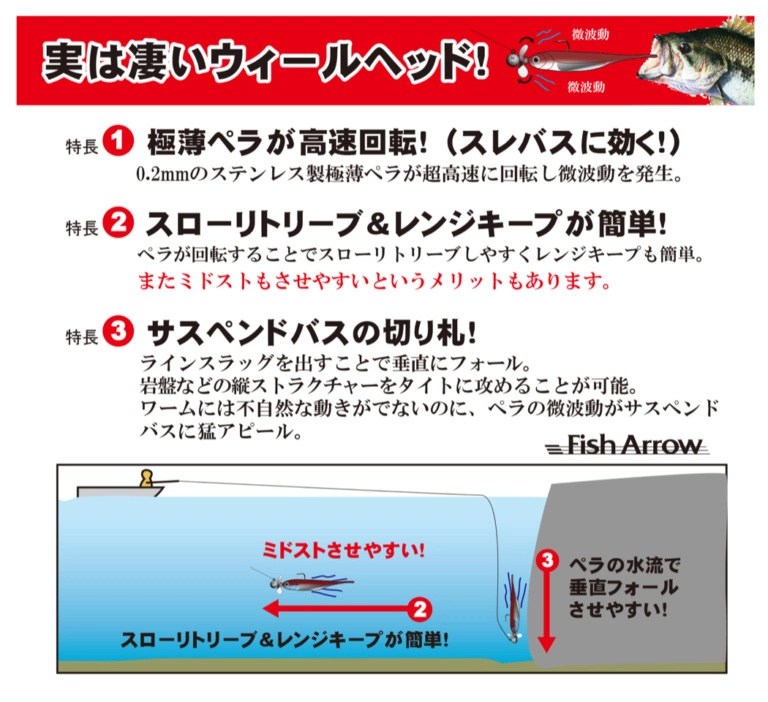 Hyväksytty JB:n ja NBC:n (Japan Bass Producers Association) sponsoroimaksi “”Feco””-sertifioiduksi tuotteeksi! Vallankumouksellinen jigipää, joka houkuttelee kaloja automaattisesti sekä pudotessaan että uidessaan! Tätä potkurilla varustettua jigipäätä (PAT.P) voi käyttää kaikissa syvyyksissä ja jopa peitteessä.Sopii jigeihin noin 7 cm:n ja 11 cm:n välillä!