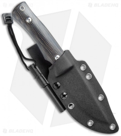 - Kydex sheath with a belt attachment and concealed Ferro rod.