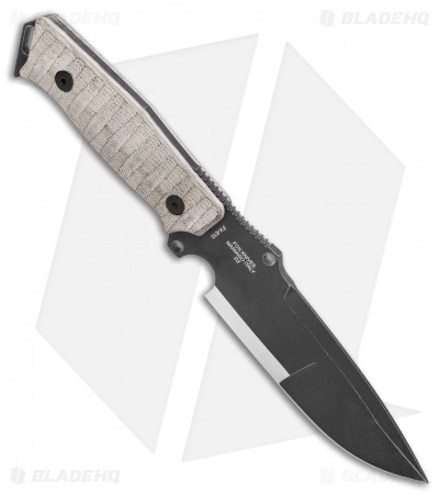 This Fox Knives Sherpa fixed blade can’t wait to be a part of your next camping trip. Tackle the outdoors with this mighty two tone blade. The steel is made from D2 steel with a black and satin finish. The drop point style extends into a full tang disclosed by the green micarta handle. The combo of the jimping on the spine and the finger choil will give you a firm grip for cuts and slices.