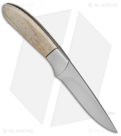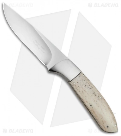 This George Muller custom Large Fixed Blade knife features a full-tang blade made from Bohler N690 stainless steel with a fine mirror polish. The handle is fitted with polished Giraffe Bone scales and polished stainless steel bolsters, and is contoured to offer a comfortable grip. Includes a genuine leather sheath for easy belt carry and secure storage.