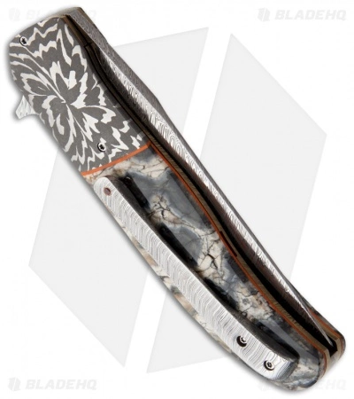 This LL-HH folder features a Heimskringla Damasteel blade with flipper and an IKBS pivot for super smooth and slick action. The handle has Ponzio mosaic Damascus bolsters and blue mammoth molar scales. Anodized titanium liners and a 416 stainless steel backstrap make up the frame. The Heimskringla Damasteel pocket clip with gem insert adds a great touch.