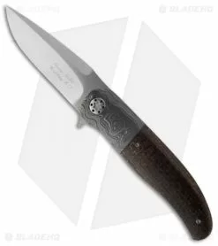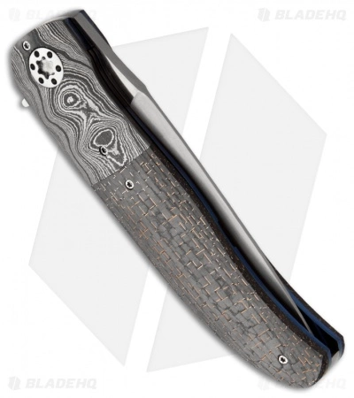 This LL-HH folder features a hand satin finished N690 steel blade with flipper and IKBS pivot for super smooth and slick action. The handle has Alabama Damascus bolsters and lightning strike carbon fiber scales. Anodized titanium liners and a Bohler N690 stainless steel backstrap make up the frame.