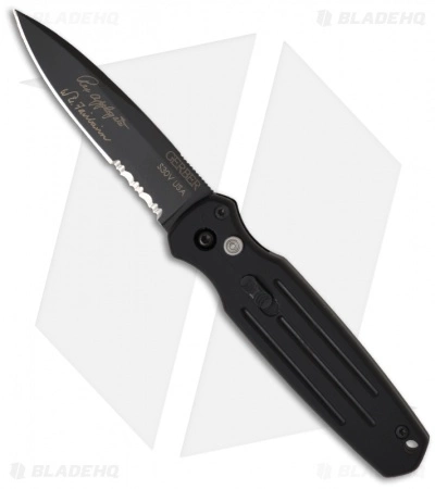 This Mini Covert Auto model has a black finished CPM-S30V stainless steel blade with a partially serrated edge and a black aluminum handle.