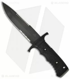 This Trident has a double-edged clip point blade that is partially serrated top and bottom. The 154CM stainless steel is non-reflective black finished. Includes a ballistic nylon sheath with BLACKHAWK! double lock positive retention insert.