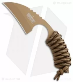 The LFK01-TPK knife has a coyote tan coated blade, and paracord handle. Khaki/Camo nylon sheath.