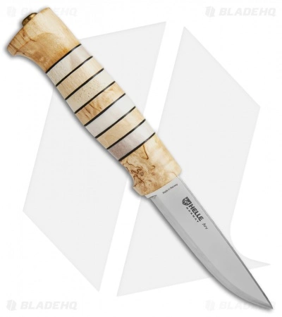 The Helle Arv features a mirror polished carbon steel blade with a Scandi grind. Its handle is made from a combination of birch and bone in a ringed pattern. Includes a genuine leather sheath.