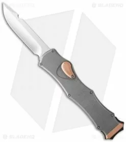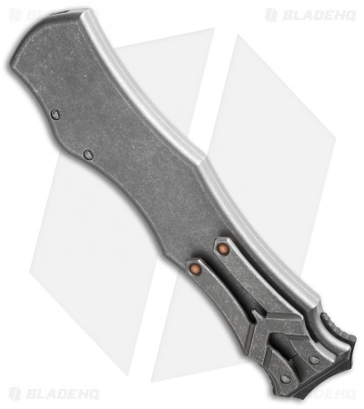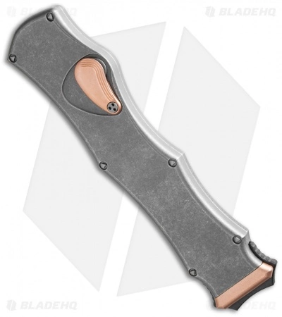 This custom Hydra out-the-front knife has strong push-button automatic action. It has a tumbled Uddeholm RoyAlloy stainless steel frame with copper accents and charging handle. The milled 6Al4V titanium pocket clip is tumbled and the draw bar is capped with a carbon fiber puller. The Elmax steel drop point blade is mirror polished with hollow grinds.