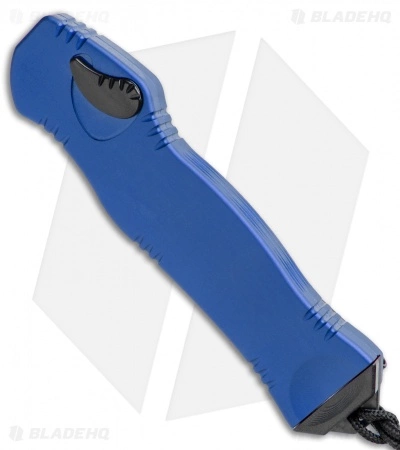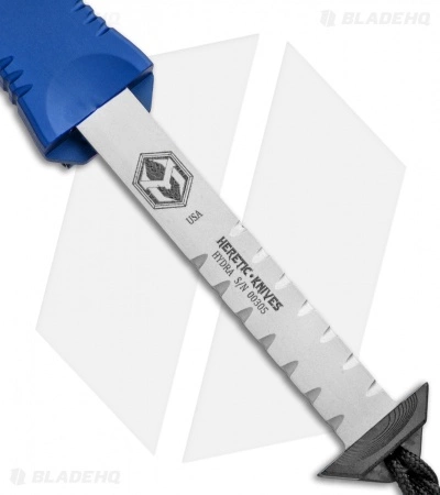 The Hydra by Heretic Knives is a powerful single-action OTF automatic knife built with a unique swiveling button safety for worry-free pocket carry. This model features a DLC coated CPM-S35VN stainless steel blade with grooved jimping along the spine. Its blue aluminum handle is comfortably contoured and textured for secure use.