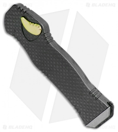 This Hydra by Heretic Knives is a powerful single-action OTF automatic knife built with a unique, gold anodized titanium swiveling button safety. It features a two-tone bead blast/stonewashed blade with grooved jimping along the spine. Its carbon fiber handle is comfortably contoured and textured for secure use. The knife comes complete with a double-pronged pocket clip and a carbon fiber charging handle grip insert.