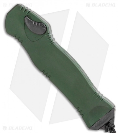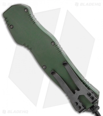 The Hydra by Heretic Knives is a powerful single-action OTF automatic knife built with a unique swiveling button safety for worry-free pocket carry. This model features a black CPM-S35VN stainless steel blade with grooved jimping along the spine. Its OD green aluminum handle is comfortably contoured and textured for secure use. After firing, just push the button and pull down on the lanyard to reload the spring. The knife comes complete with a Battleworn double-pronged pocket clip.
