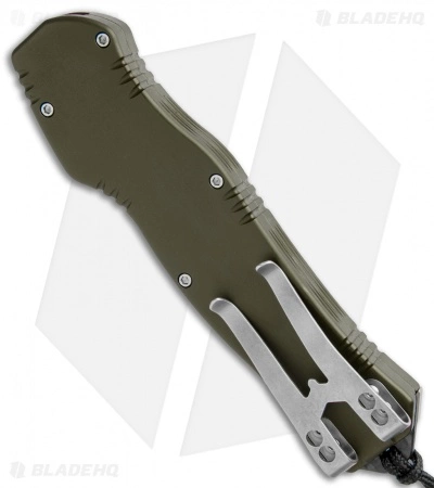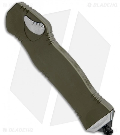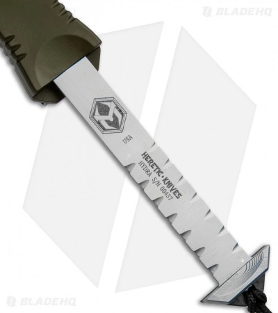 The Hydra by Heretic Knives is a powerful single-action OTF automatic knife built with a unique swiveling button safety for worry-free pocket carry. This model features a stonewashed CPM-S35VN stainless steel blade with grooved jimping along the spine. Its green aluminum handle is comfortably contoured and textured for secure use.