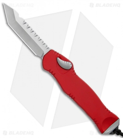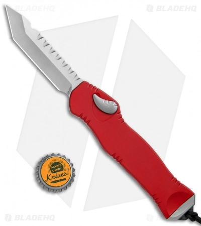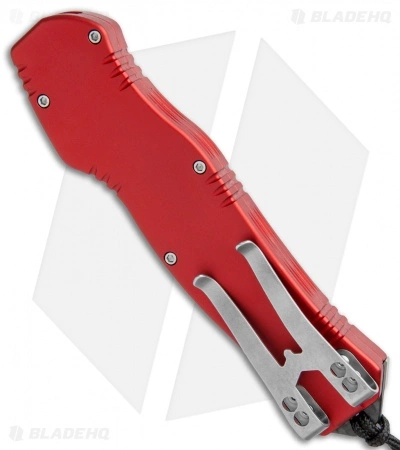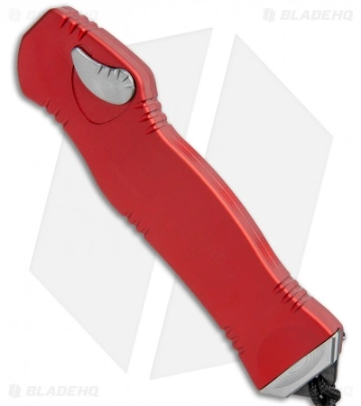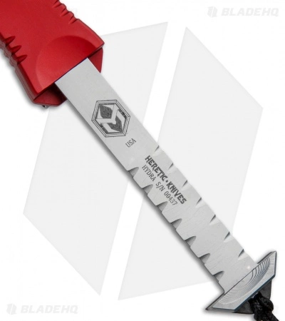 The Hydra by Heretic Knives is a powerful single-action OTF automatic knife built with a unique swiveling button safety for worry-free pocket carry. This model features a stonewashed Elmax stainless steel blade with grooved jimping along the spine. Its red aluminum handle is comfortably contoured and textured for secure use.
