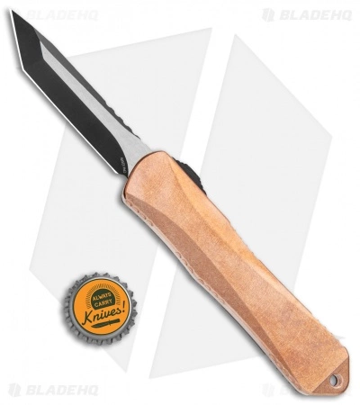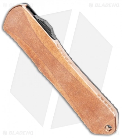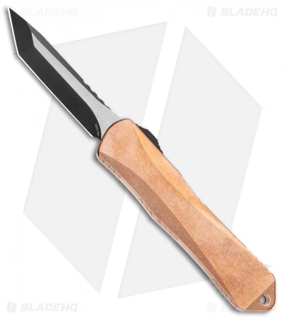 This Manticore-E has a copper and carbon fiber handle. Over time the copper will acquire a beautiful patina. It also features a DLC coated tanto blade.