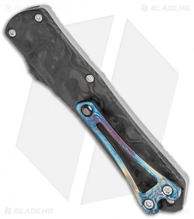 This Manticore-S has a marble carbon fiber and stainless steel handle. It is topped off with a hand ground damascus dagger style blade and entropic anodized titanium pocket clip.