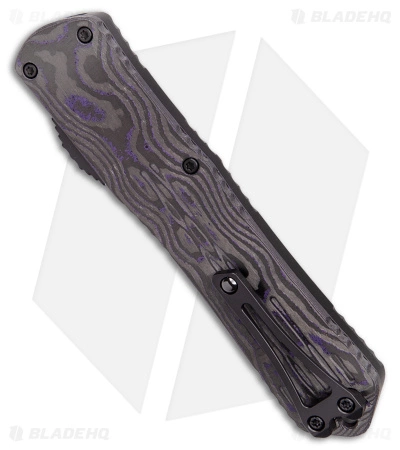 - Black and purple camo aluminum and carbon fiber handle with scalloped jimping.