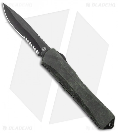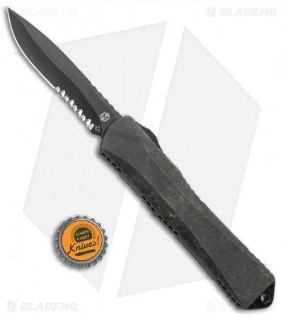 This model of the Manticore-X comes equipped with a black DLC serrated drop point blade and a Breakthrough green anodized aluminum handle.