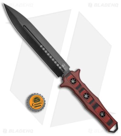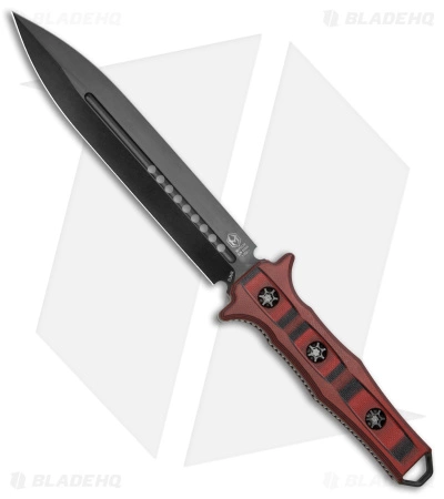 - Black and red G-10 handle scales over a jimped full tang.