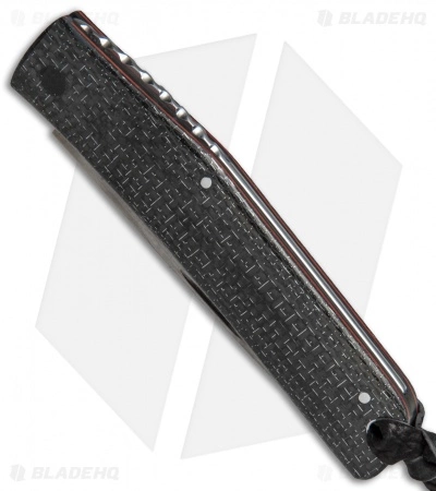 This OLF 100 SDS slip joint folder has a lightning strike carbon fiber handle and an Aogami Super carbon steel blade. The blade opens with a nail nick opener and secures with a slip joint lock. A fileworked stainless backspacer finishes off the custom design. Item Includes a leather sheath and a paracord lanyard. Direct from maker.