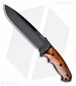 The EX-F01 knife is tough, with a 1/4″ thick A2 tool steel blade this tactical fixed blade isn’t the type to let you down. The 7″ KG Gun-Kote finished drop point blade is full tang with an extended breaker at the base. The shape and contour of the handle offers extreme comfort and grip with the index groove below and spine notches up top. The Cocobolo wood scales are beautiful and supremely contoured for a grip that you’d expect from Hogue. The EX-F01 includes a black ballistic nylon sheath with a MOLLE compatible back.